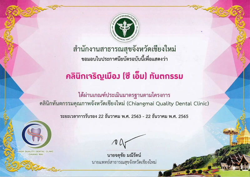 คลินิก เจริญเมือง (ซี.เอ็ม) ทันตกรรม (CM Dental Clinic) ได้รับ ประกาศนียบัตร ผ่านเกณฑ์ประเมินมาตรฐานตามโครงการ